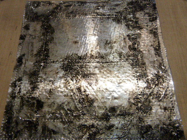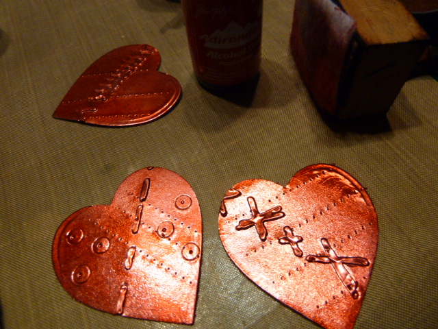 I added lots of texture and faux rivets using any tools on hand and then painted on black acrylic paint which I wiped back. I also added some alcohol inks.