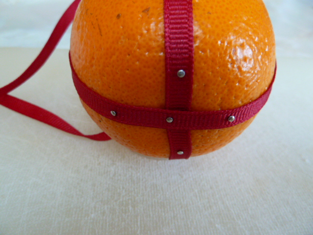 Divide the orange into quarters by wrapping around the ribbon and crossing it over underneath
