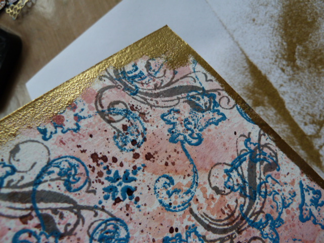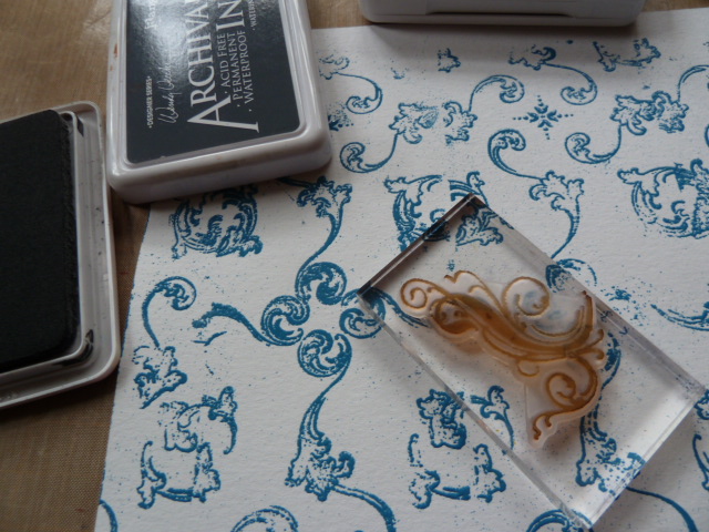 I embossed first with blue and then added some archival ink on a Tim Holtz flourish stamp