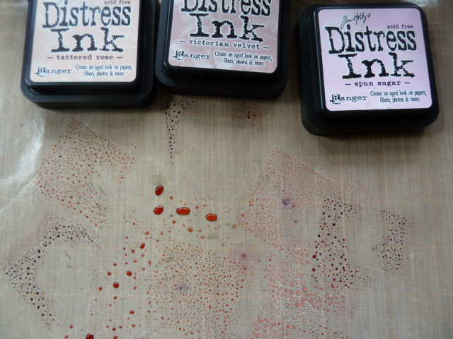 I stamped some roses onto vellum and embossed them in white. I then found a old stamp which has a flourish repeating pattern to recreate a wallpaper look.