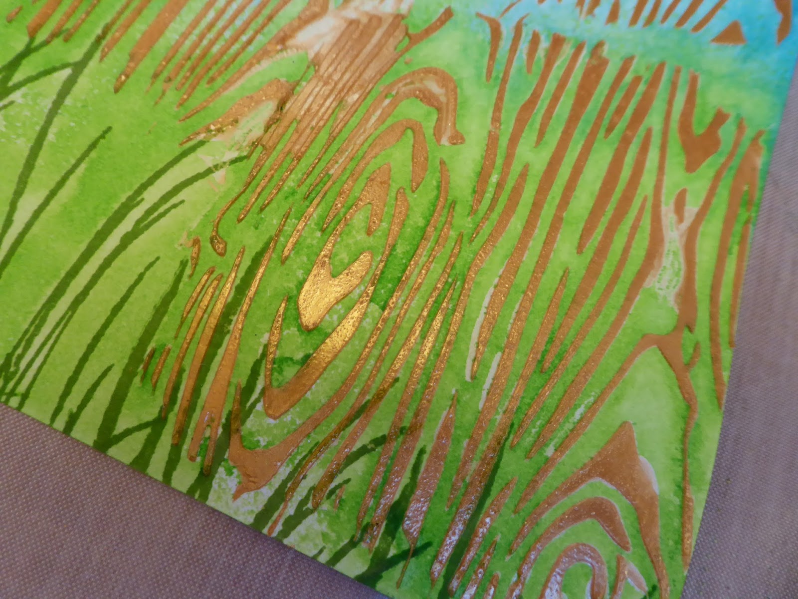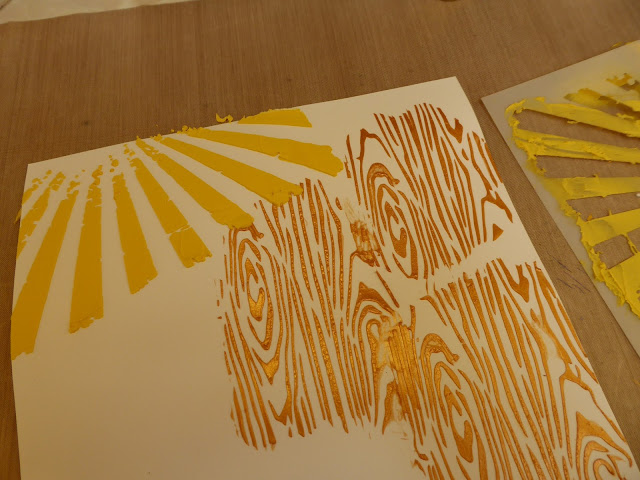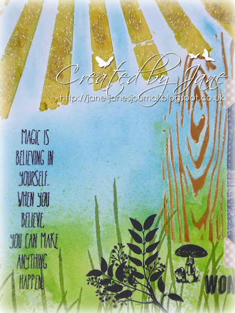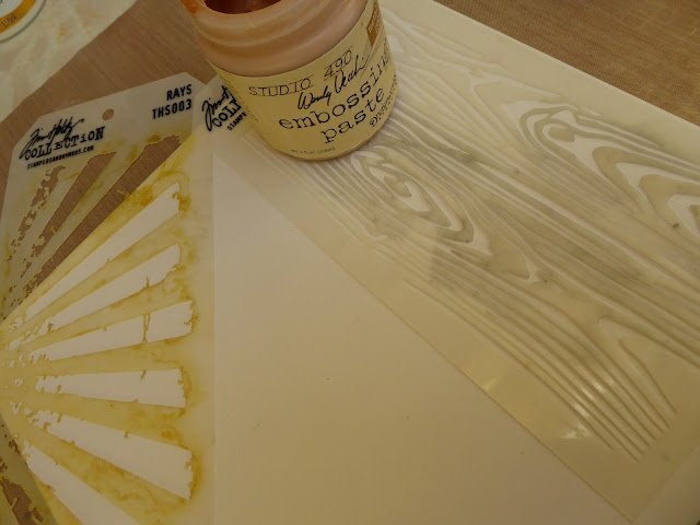 I chose my bark and rays TH stencils to add lots of sparkly textures to represent our glorious sunny day.I used Wendy Vecchi's gold embossing paste for the bark and heated it to make it bubble for even more texture