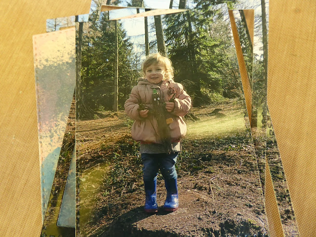 I chose this lovely photo of Daisy with her Stick Man and die cut it with my MB stitched rectangle dies into 3 frames.