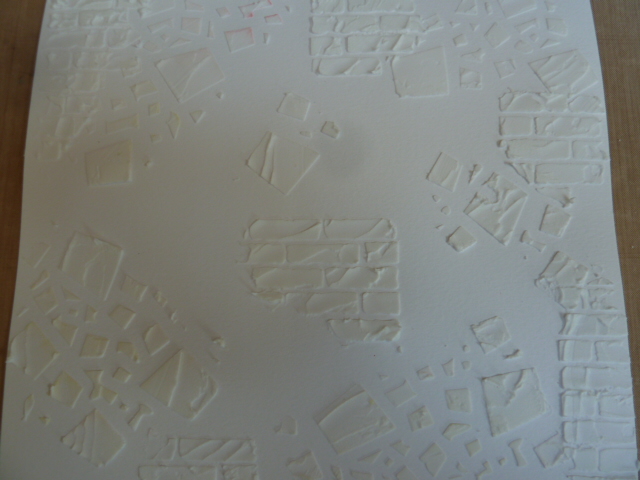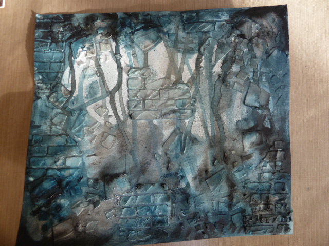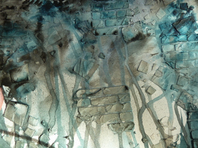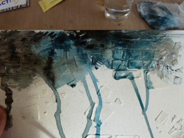I put some embossed acrylic behind my window to represent the reflections from the glass and also the river. I added blue paint to the raised areas.