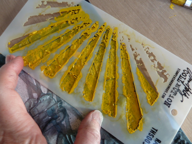 I had some ideas to play with. There were so many great textures at The Shard, cool brickwork, glass, metal etc. I created a textured background using texture paste and using lots of angular Shard - like and brickwork stencils.