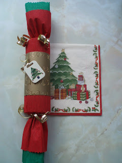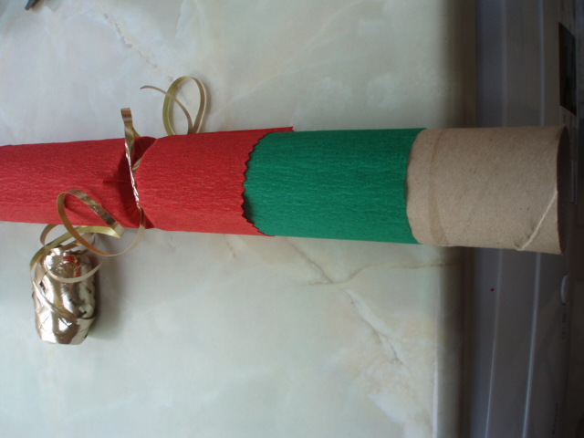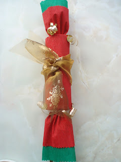 I decided to use green and red crepe paper and then to pick out the gold as an extra wrap around the cracker (any wrapping paper works well). I have not quite finished the 8 that I need but here are 3 of them finished.