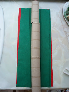Unroll the crepe paper and lie it full width and then cut 2 pieces of crepe paper that will meet around the middle of the tubes.This can be either a single colour or 2 as I have shown here.