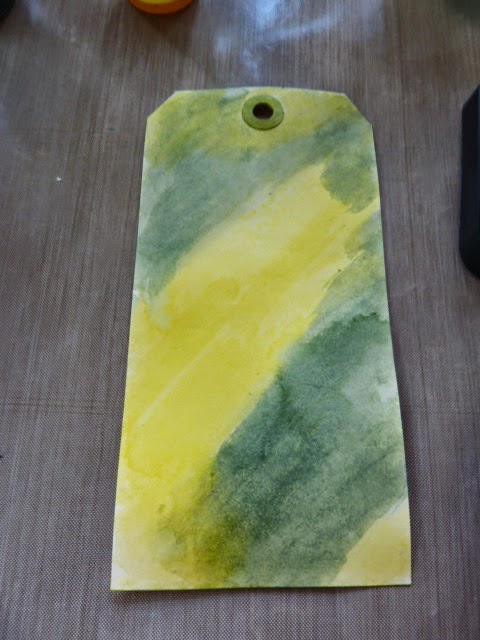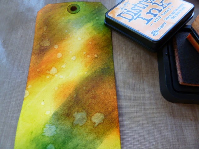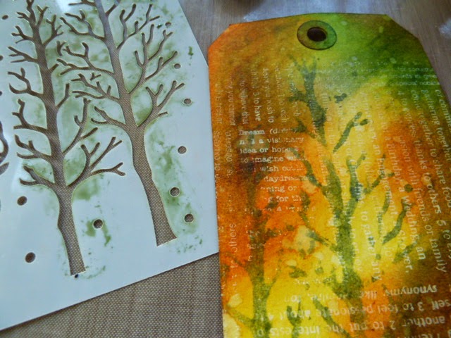 I swished on the 2 colours to represent the tress and the sunshine...I wanted to sunshine to be glinting trough the trees. I then dried my tag and repeated the process to built up a couple more layers of stain.