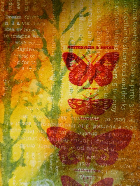 which is also one of my homework pieces from Creative Chemistry 101, lesson 5. It just shows that you don't need all the colours of Distress Stains to still get a fun result. I really like the way the "sun" is glinting through the tree stencil and the butterflies look as if they have found some shade lower down.
