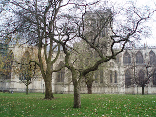 The tea room is on the upper floor of this shop, at the front. We sat by the window where the two Christmas trees are close together on the outside wall. We so enjoyed watching the bustle of the shoppers below and it was good to rest our legs for a while. Before we headed back to our hotel to get ready for the party we took a last stroll around the grounds of the Minster where it is so peaceful.