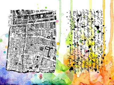 You can see that I used my black card as a base for my "window"and stuck the maps on top. I then added my trellis mixed media window sheet so that the maps are sandwiched between the layers.
