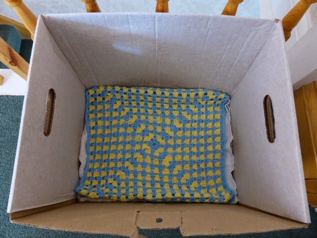 She got the hint and went up to my box on the landing to get an idea of the size. Now you may think, goodness me, that is a rather old battered box (it was from when Daisy's Mum was at Uni and they put her furniture into storage in Leeds one summer when she was between houses). This is my box and I will not sleep in any other box or any other bed as I will not use it. Jane muttered something like, yes we have tried buying you other prettier (how can my box not be called pretty?) beds but this 10 year old + old box still remains. Hmmm I can't see what she is complaining about.What is there not to love about my bed?The front is even bend down to a perfect angle where I have jumped in and out of it, it's perfect for me. I have a little cloth inside which gets washed each week...here it is