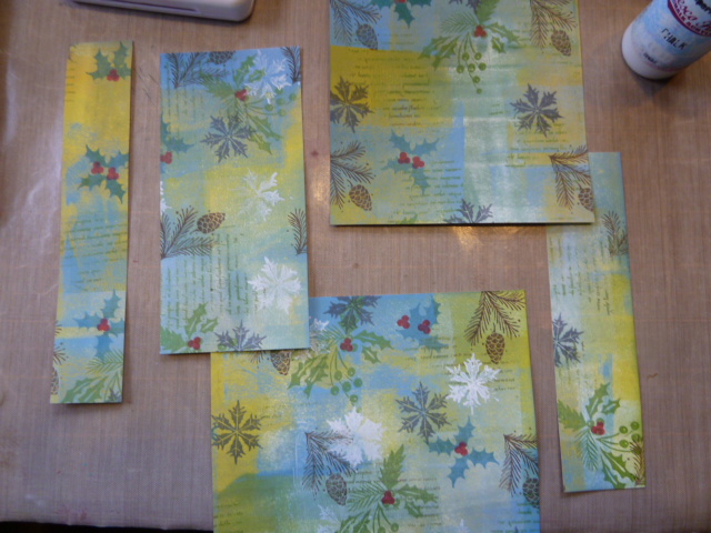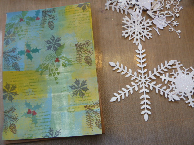 I added snowflakes to a couple of the pieces by stamping with white acrylic paint. I shall be using these other pieces for my last cards.