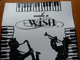 I used the keyboard as a border and the 2 jazz players as the focals. I stamped the keyboards in Black Versafine ink which I clear embossed to get some texture. The jazz players were just stamped.