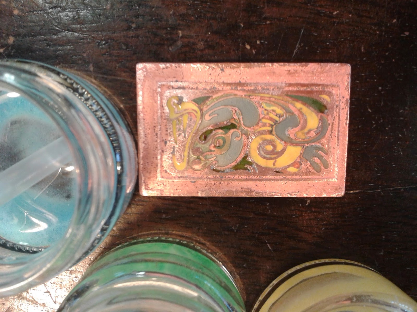 As I am showing some of my jewellery today I thought I would take the opportunity to share the summer term projects from my silversmithing class. First up is an etched copper blank which I also added some enamel to. This was more a technique piece but I may use this on a lid of a box.