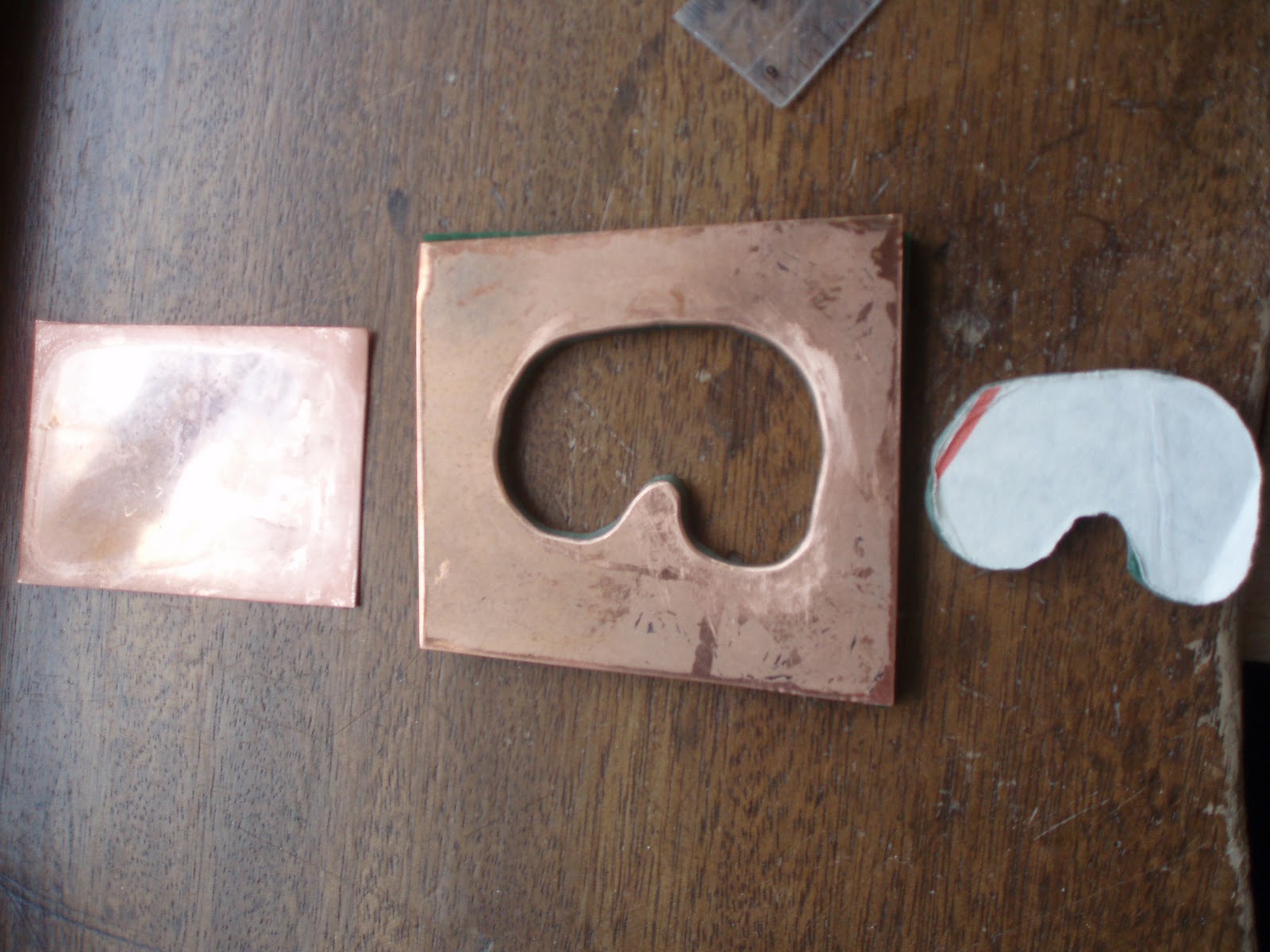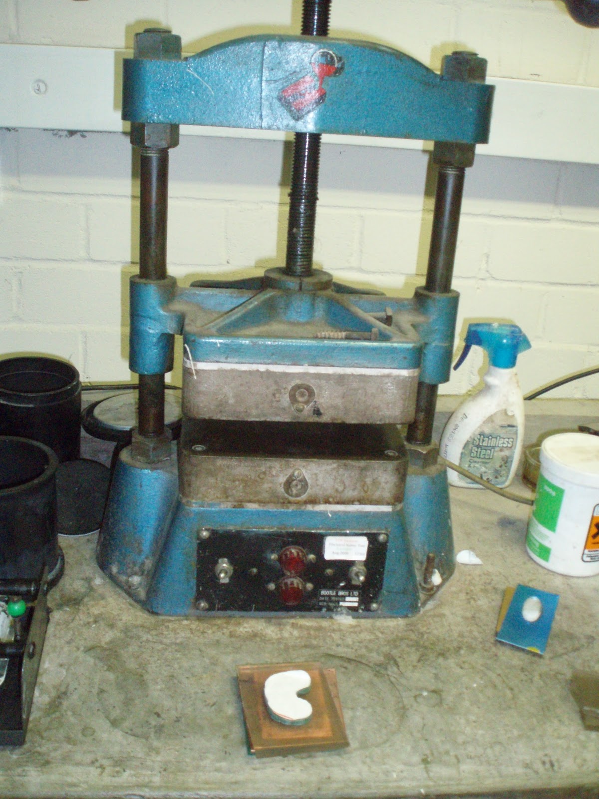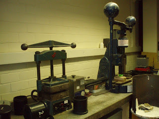 A "sandwich" was then formed with the pieces put either side of a piece of flat copper together with some padding. It was put into the press, the handle was screwed down and out came................