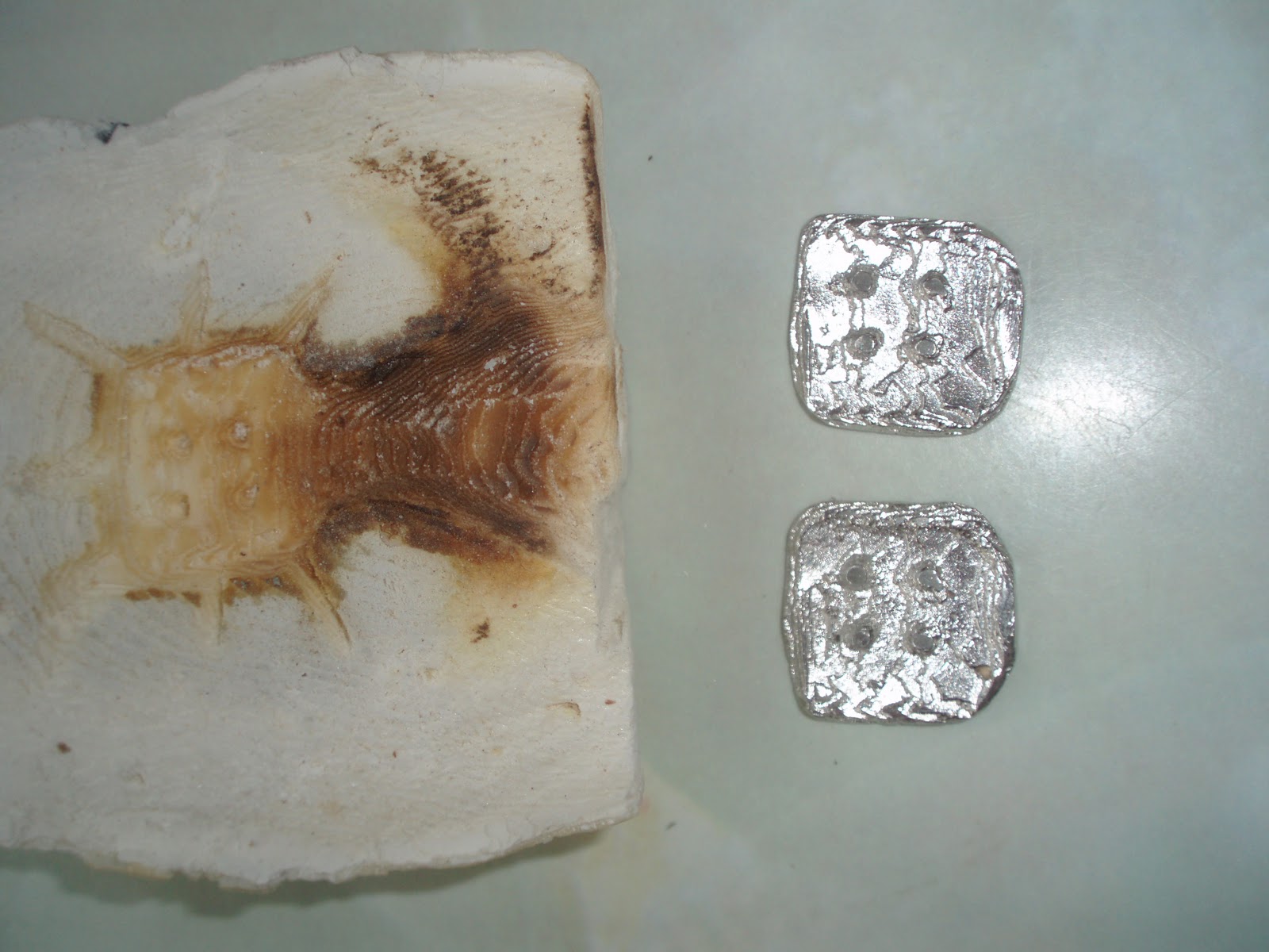 This is the shape I carved to create some cuff links for my Hb. The spiky lines out at the sides are air vents to allow the molten metal to "flow" and any air to escape. The brown area is where the molten metal poured in burns the opening to the mould. It is pretty interesting handling bubbling metal, not for the faint hearted!