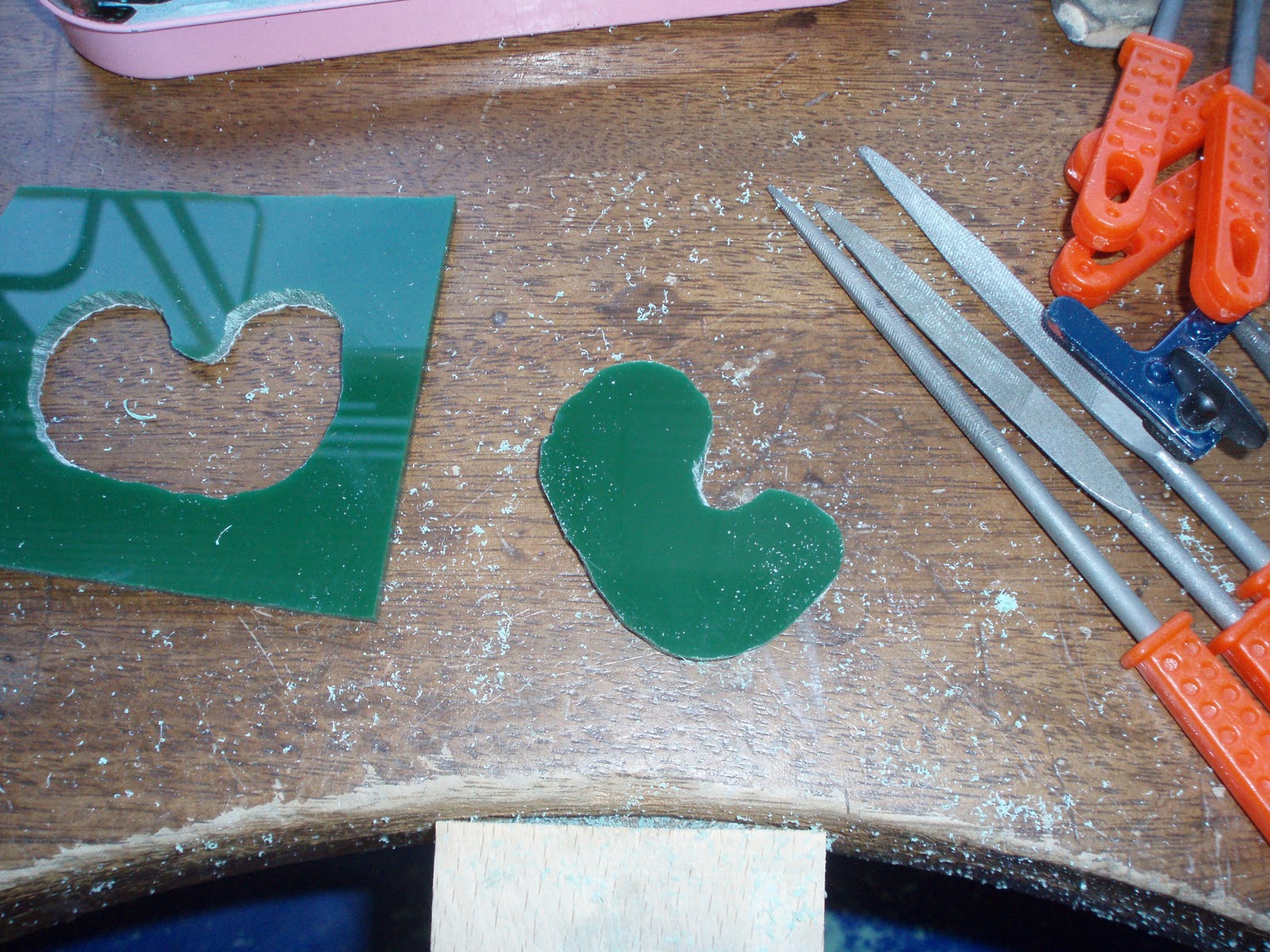 The brass  templates was then stuck to the perspex template and the 2 had to be filed smooth together so that when the piece was formed in the press there would be no sharp edges. I spent some time filing away until the shape was ready for press forming.