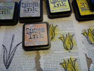 I stamped my PaperArtsy tulip onto book paper which I had also coloured with DIs.