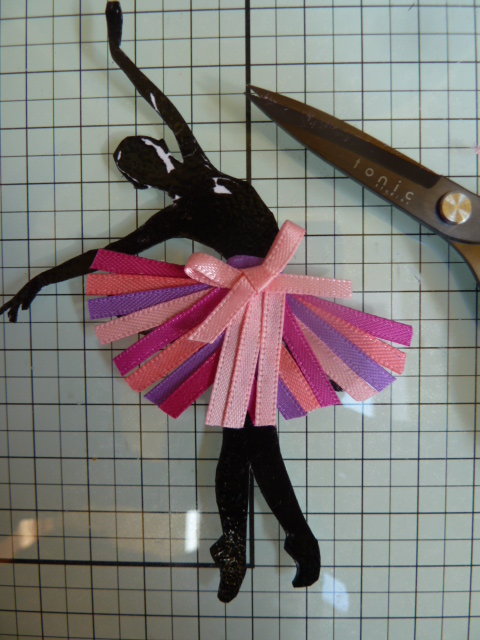 I then went round her edges with black pen to get rid of any white card showing. I cut pieces of Crafty Ribbons 3mm satin ribbon (you don't need to be precise at this point) and stuck them onto double sided tape which was the same shape as her skirt.
