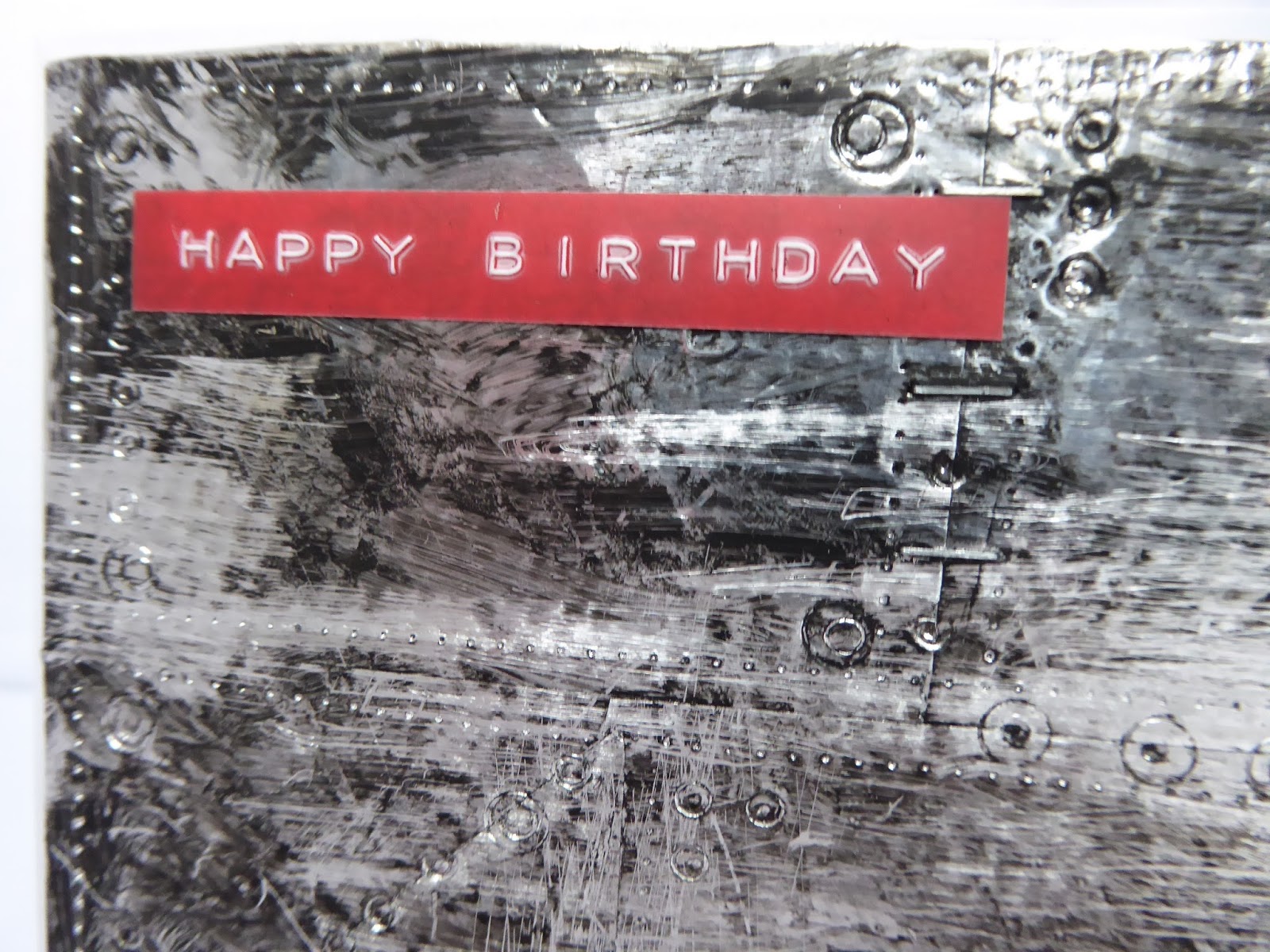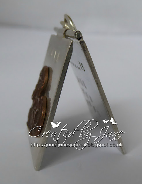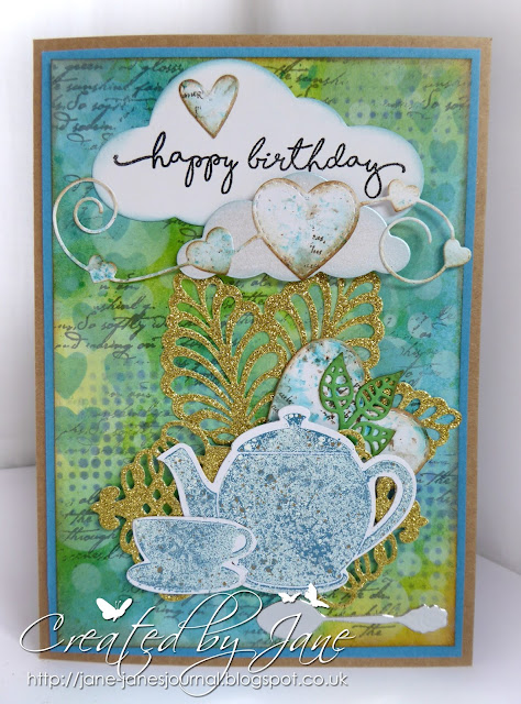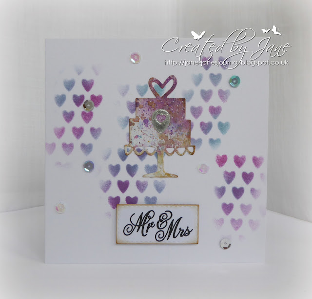 It's a very CAS wedding card made for Dotty's Teahouse. The die cut is Sizzix, the stencilled hearts are a Tim Holtz stencil. The maker of the sentiment escapes me ,sorry!