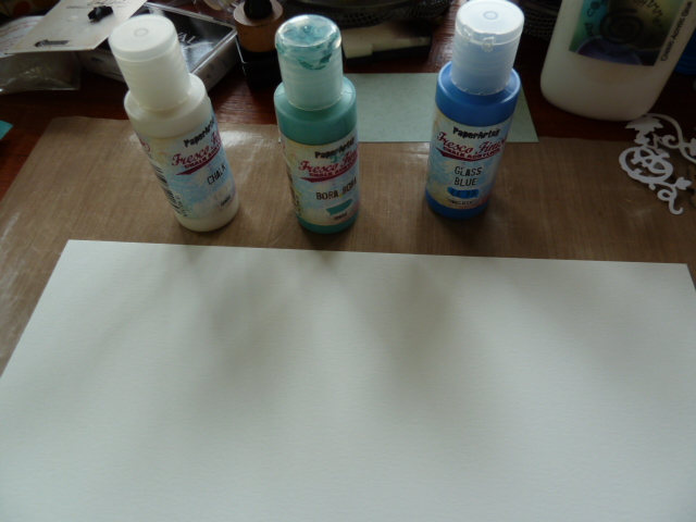 I chose 2 blue and 1 white Paperartsy Fresco acrylic paints. I used a sheet of mixed media card.