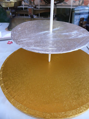 I had to create a central support and needed a thin cake board for the top tier (which would be invisible) and then the usual drum at the bottom.