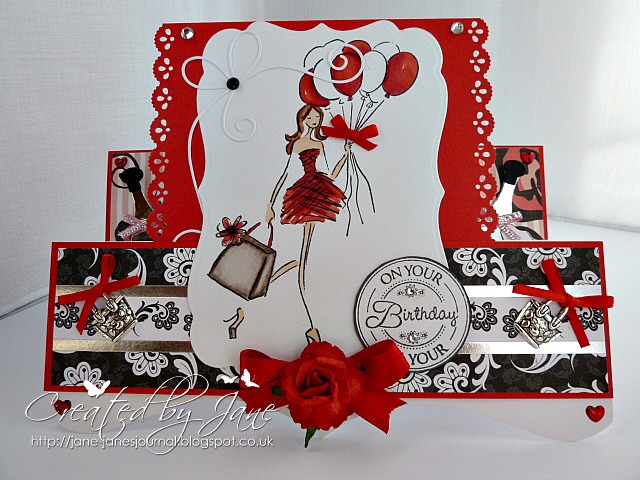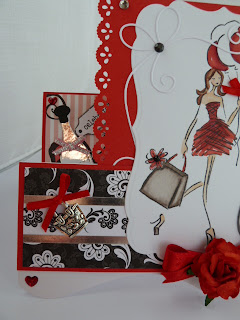 I made her a stepper card and used my fab Penny Black stamp, La soiree. This stamp was the very first prize I ever won from entering card challenges. It really epitomizes my daughter...the shoes, the dress and bag say it all ;0) I coloured my stamp with my trusty Promarkers and I used Labels 17 Spellbinders to cut her out.