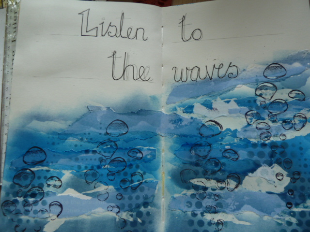 I wanted plenty of texture for the sea, just as we had seen it so I started with some strips of left over paper from my travel journal.