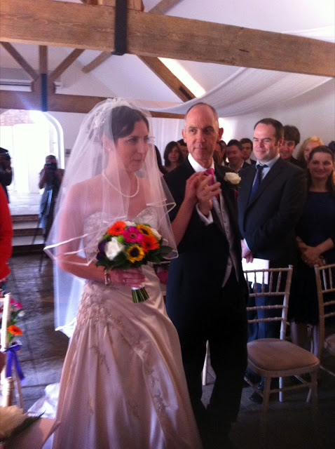 The guests all gathered together in the ceremony room and we took our seats. At 3.05pm the music struck up and everyone turned around to see the bridesmaids appear at the top of the steps and behind them the silhouette of Milly and my Hb in the door way. Their sunflower bouquets were so sunny and bright. You could not but smile.