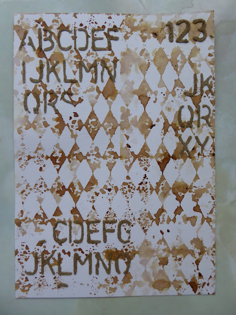 I decided to use my harlequin stencil and vintage photo distress ink for my monoprinting.